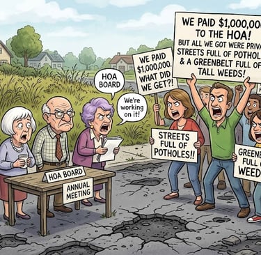 So, what happened to all our money instead? Well, one "Board" after another gave most of our money to FOR PROFIT companies who did NOTHING to keep our Common Areas in good repair, and to make the situation worse, the current Fake Board spent most, if not all our money, which should have been going to a Maintenance Fund, on a lawyer to cover up their many misdeeds and to hire a strange guy who falsely claimed he has an HOA management company called "Phoenix," which turned out to be completely fake and exists only on paper! So, now, we also have to wonder what he'll do if he gets his hands on however much, if any, of our money is left, not for any street maintenance, not anything else!