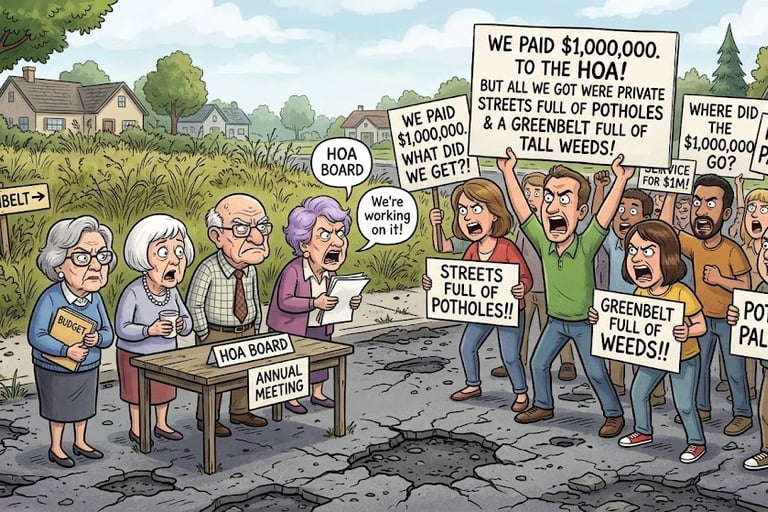 But guess what our latest Fake Board says is the "answer": They want to raise our dues, even as much as by twice what we're already paying them!!! Yup! Even though we have given the HOA $1,000,000.00 over the last 20 years, now, because they wasted or misappropriated most of OUR MONEY to enrich HOA management companies, over-priced landscapers, needless insurance brokers, and for about a year now, a lawyer who did nothing but cover up their misdeeds, now they want us to give them even more!!!